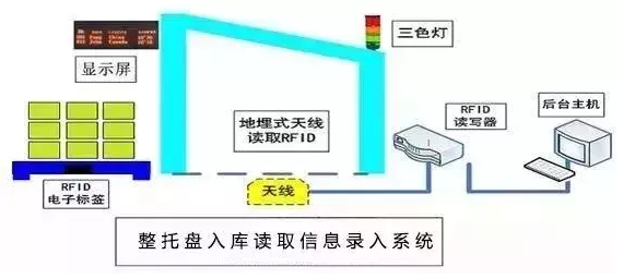 当带板运输的货物通过进货口传送带或RFID门禁通道进入仓库时,RFID读写器将经过压缩处理的整个托盘货箱条码信息写入托盘管理电子标签中,然后通过计算机仓储管理信息系统运算出货位,并通过网络系统将存货指令发到叉车车载系统,按照要求存放到相应货位。